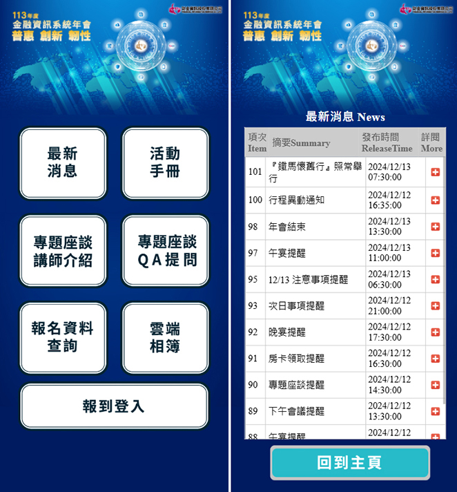 藍訊科技為本次年會設計了專屬的客製化活動選單,將所有重要的活動資訊整合在一個頁面。與會者透過手機即可輕鬆瀏覽,內容包含最新消息、專題講座講師介紹、報名資料查詢、活動手冊與Q&A提問區。這項一站式服務不僅讓與會者能隨時掌握活動最新動態,更大幅減少了紙本印刷與人力協調的需求,實現無紙化管理。