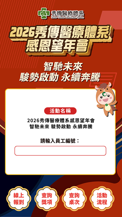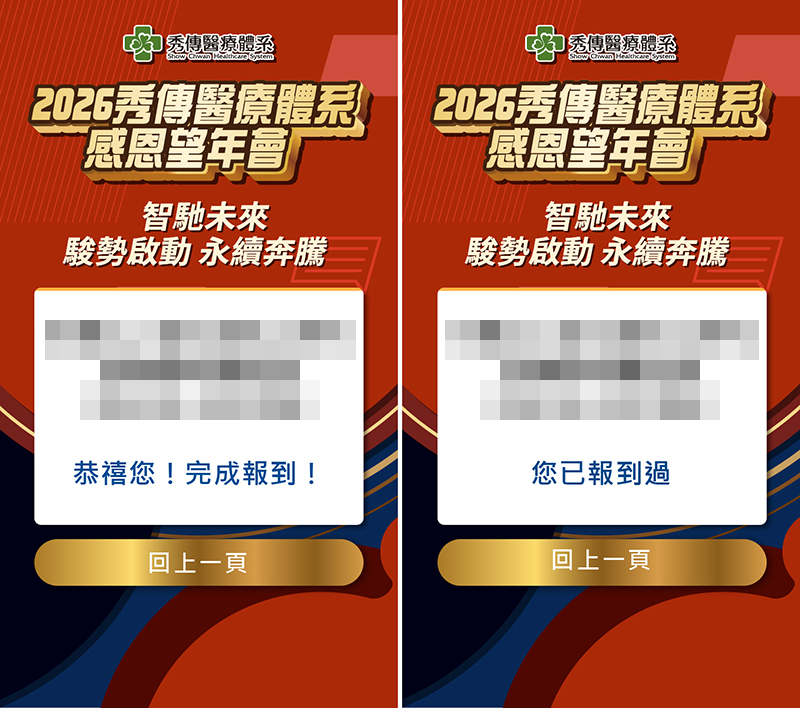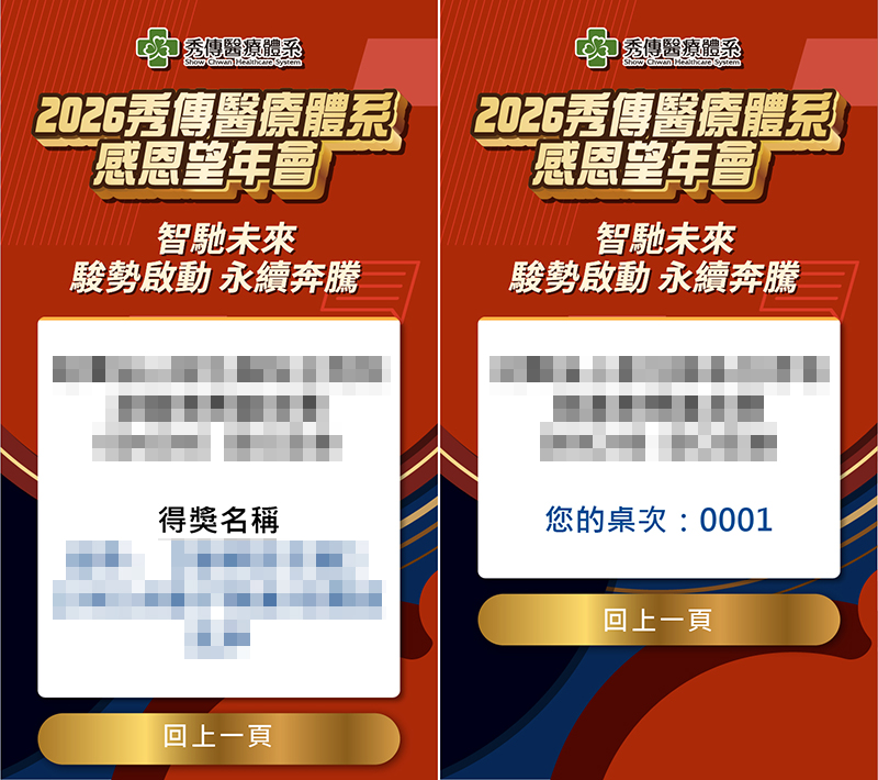 • 【翻玩整合行銷】2026秀傳2300人感恩望年會-線上自行報到+客製化抽獎(自行操作)+客製化活動整合選單+查獎+查桌次+抽獎按鈕