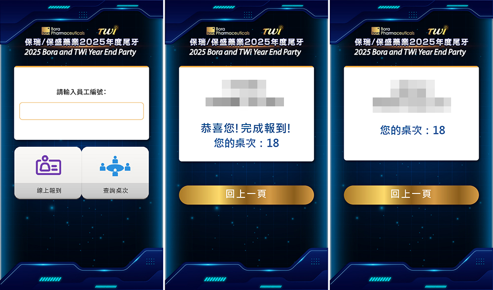 在保瑞/保盛的晚宴現場,再也看不到擁擠的簽到處。同仁只需拿起手機進行「線上自行報到」,指尖輕點即可完成。最貼心的是,系統會同步連動「智慧查詢桌次」,讓 150 位賓客一進場就能秒知座位,優雅且從容地入座交流,將活動的第一印象拉升至精品級水準。