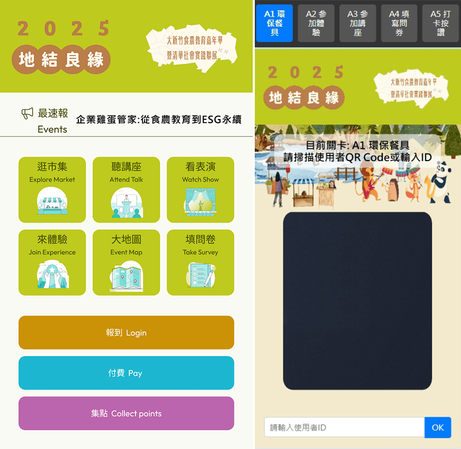 以「反向闖關 × 智慧支付」為核心的 ESG 區域,透過工作人員操作介面輸入或掃描使用者ID完成集章,流程更秩序化、教育性更強。