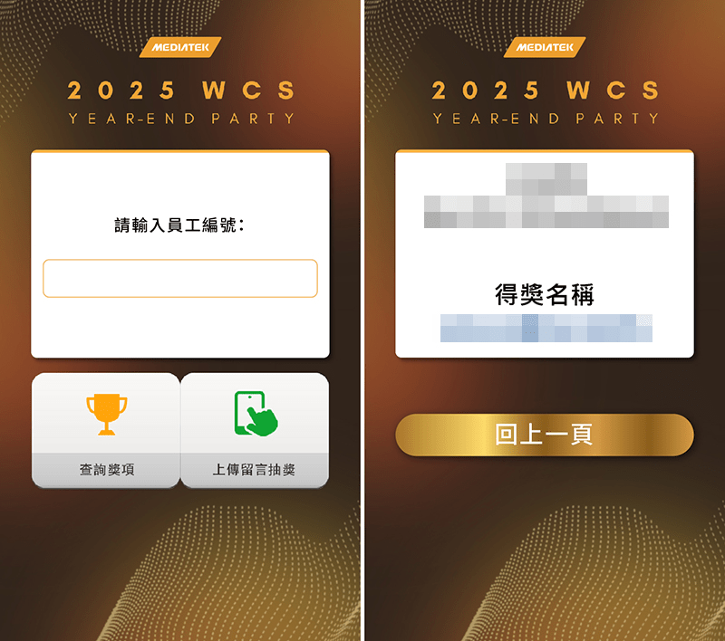 • 個人化查獎系統:同仁無需起身排隊或擁擠在查獎牆前,只需在手機端輸入員編,即可一鍵查詢中獎資訊。