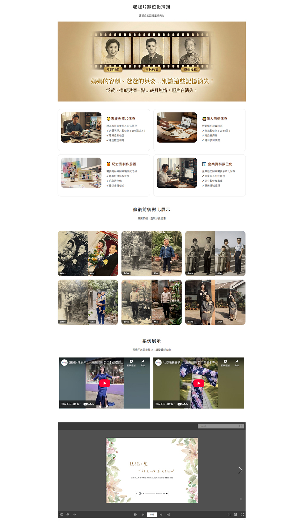 深信每段人生都值得被精緻典藏。新官網的服務項目區塊,不僅是資訊的展示,更是對生命尊重的體現。透過老照片數位化掃描,褪色的回憶得以永久保存;而專業的破損照片修復,則能讓重要長輩的容顏重獲新生。