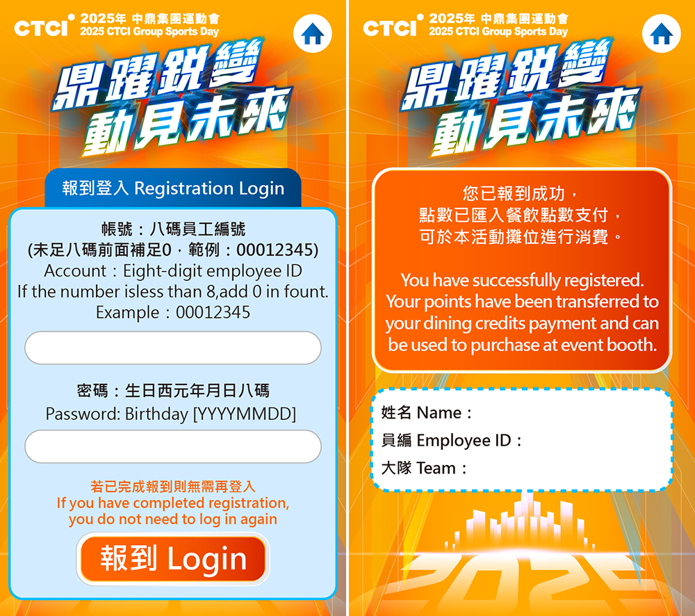 告別傳統冗長流程,員工及家屬可透過手機輸入八碼員工編號和生日八碼作為密碼,輕鬆完成自行報到。這不僅顯著提升了入場效率,更實現了無紙化報到,完美呼應中鼎集團的永續精神。報到成功後,系統即時顯示「點數已匯入餐飲點數支付」訊息,讓來賓能立即進行消費。