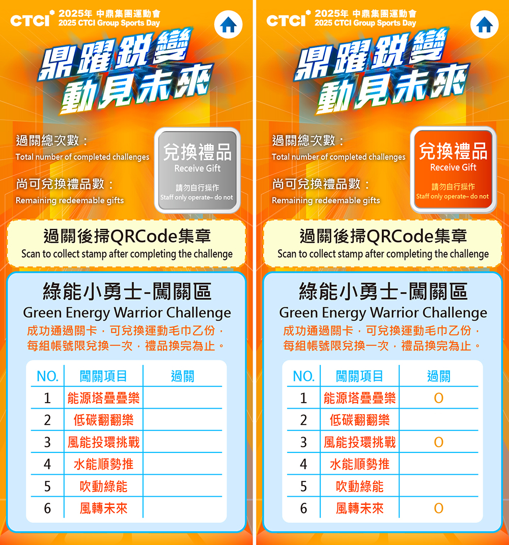 名為「綠能小勇士-闖關區」的多元趣味關卡,參與者僅需掃描專屬 QRCode 即可即時記錄闖關進度。完成關卡後,兌換禮品按鈕即會亮起,參與者可憑此兌換獎品乙份,極大化親子同樂的互動性。